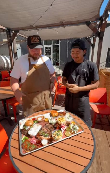 Click the picture of Pitmaster Jason and Chef Erick talking up our yummy BBQ Platter!